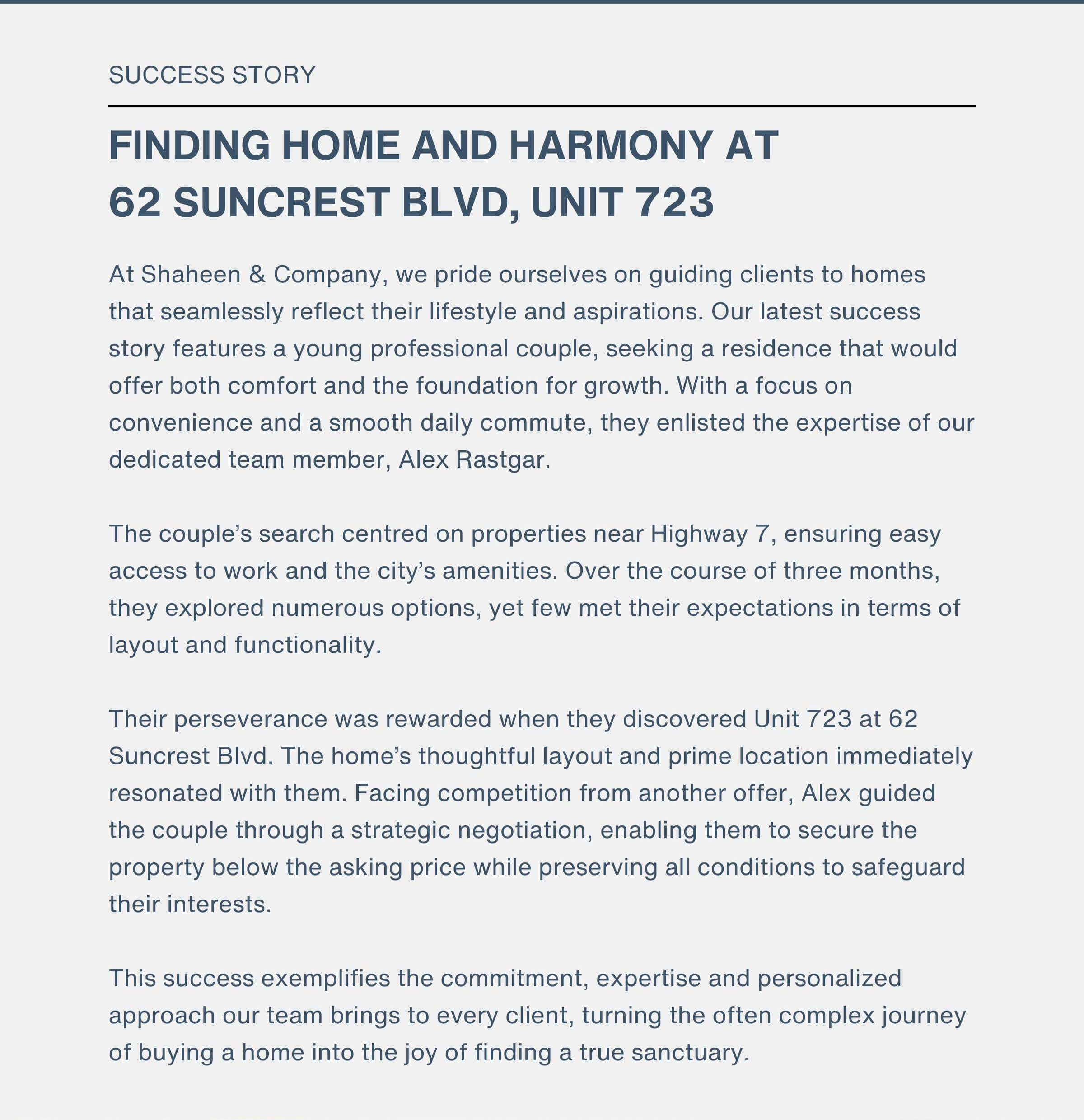 Thank you for considering Shaheen & Company as your real estate advisors. Our clients are an integral part of our team. We would be honoured to work with you on achieving your real estate goals.