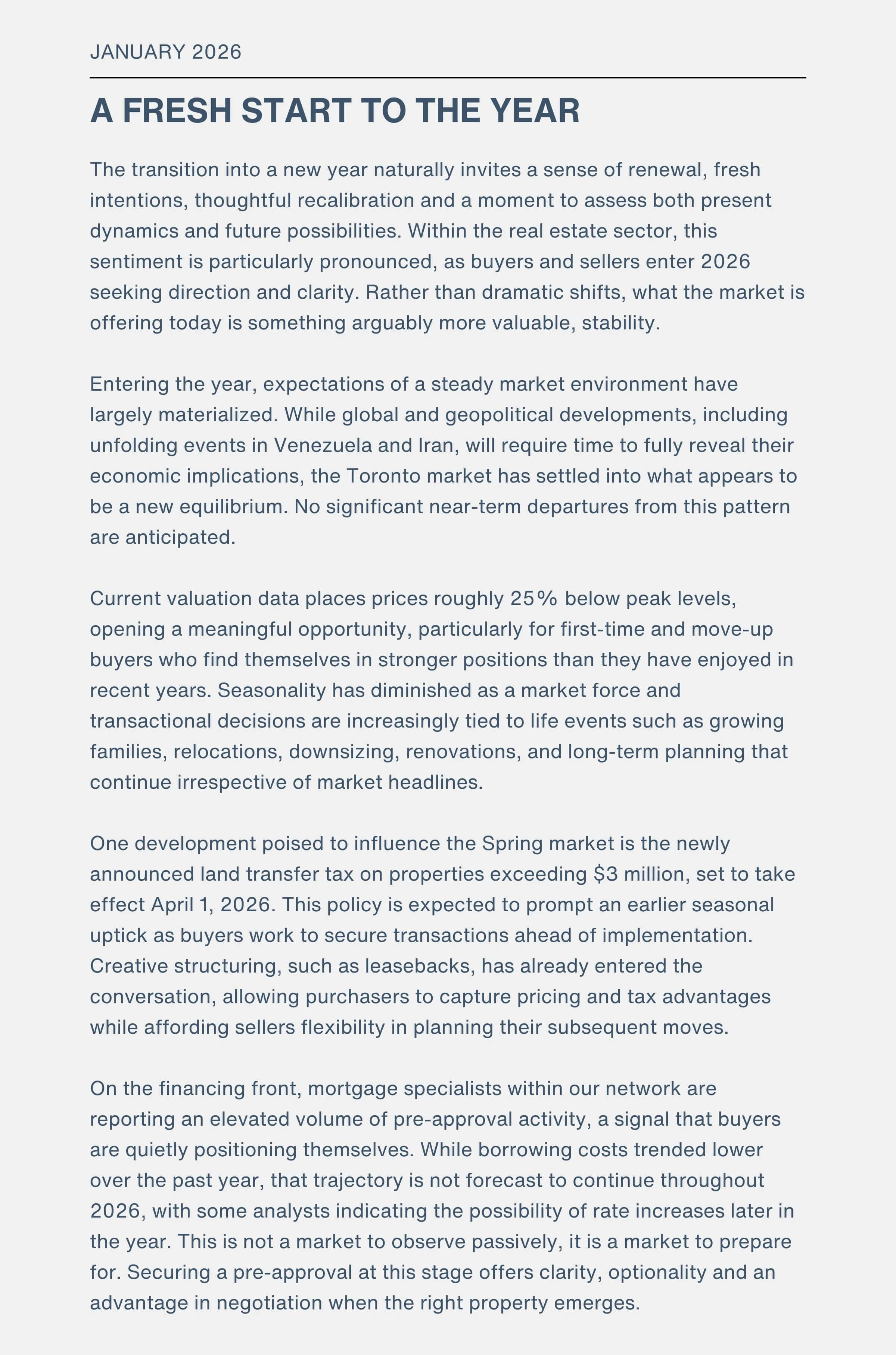 The transition into a new year naturally invites a sense of renewal, fresh intentions, thoughtful recalibration and a moment to assess both present dynamics and future possibilities. Within the real estate sector, this sentiment is particularly pronounced, as buyers and sellers enter 2026 seeking direction and clarity. Rather than dramatic shifts, what the market is offering today is something arguably more valuable, stability.